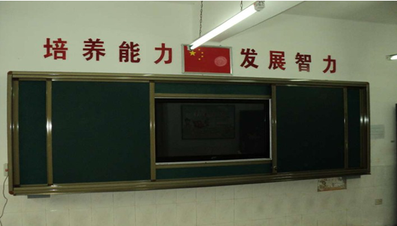 2. 外滑軌裝置:安裝兩塊移動綠板,兩綠板尺寸之和與內(nèi)軌道白板的尺寸一致;進(jìn)行常規(guī)教學(xué)時,可將此綠板滑動到液晶電視前方,保護(hù)液晶觸摸一體機(jī),增大書寫面積;進(jìn)行多媒體教學(xué)時,將綠板拉開,使用液晶觸摸一體機(jī)。